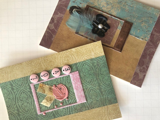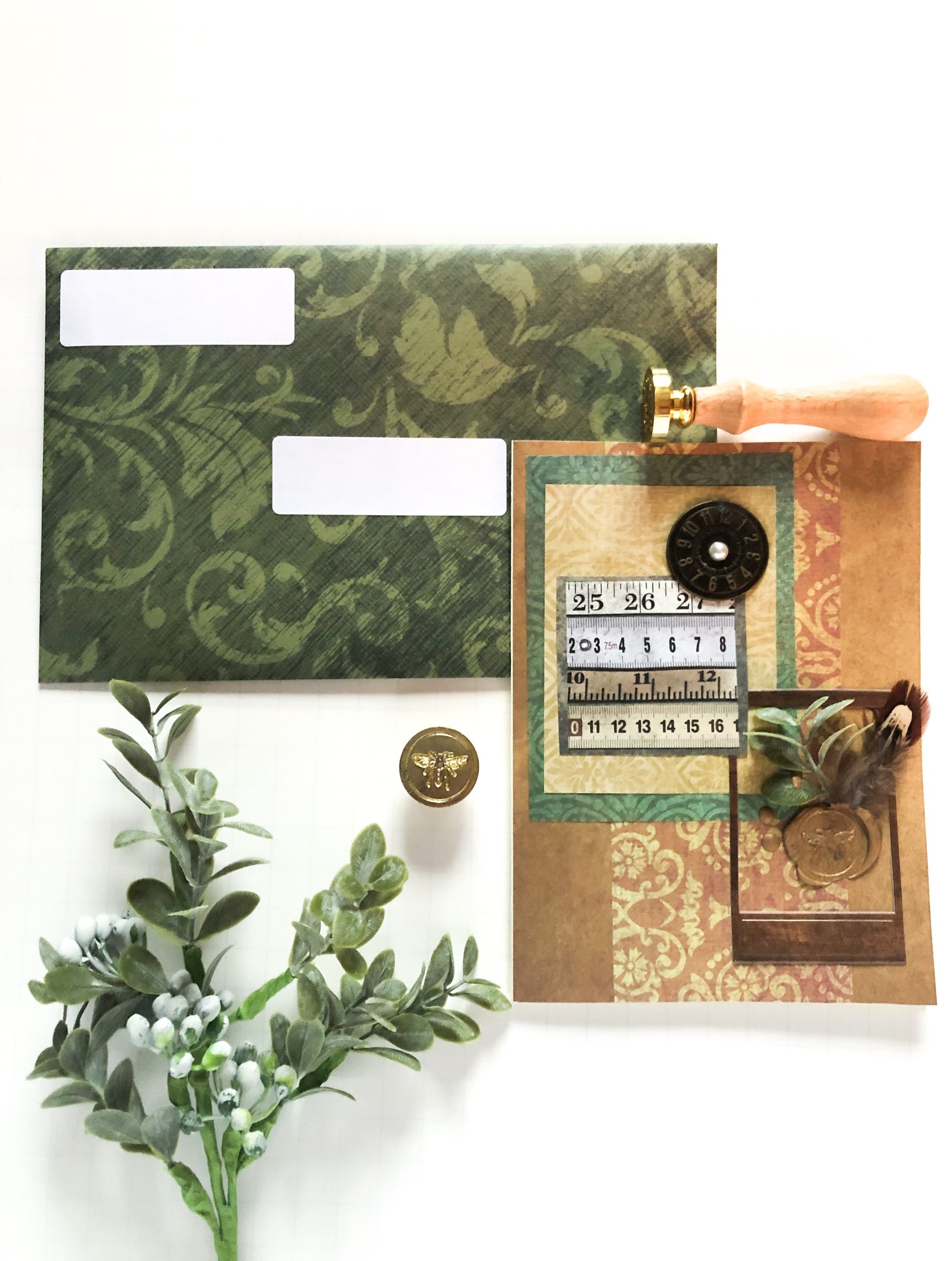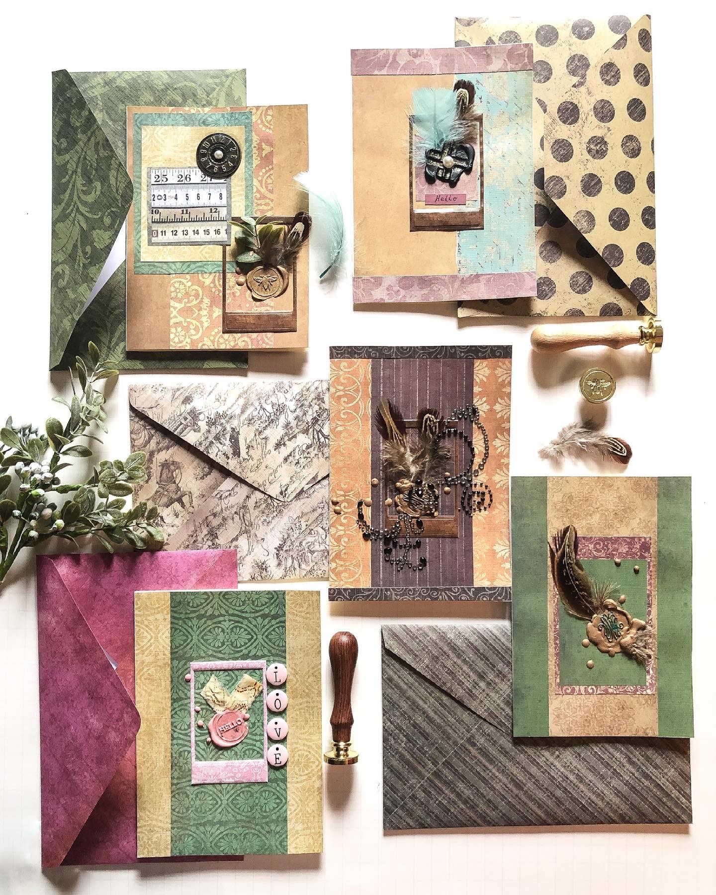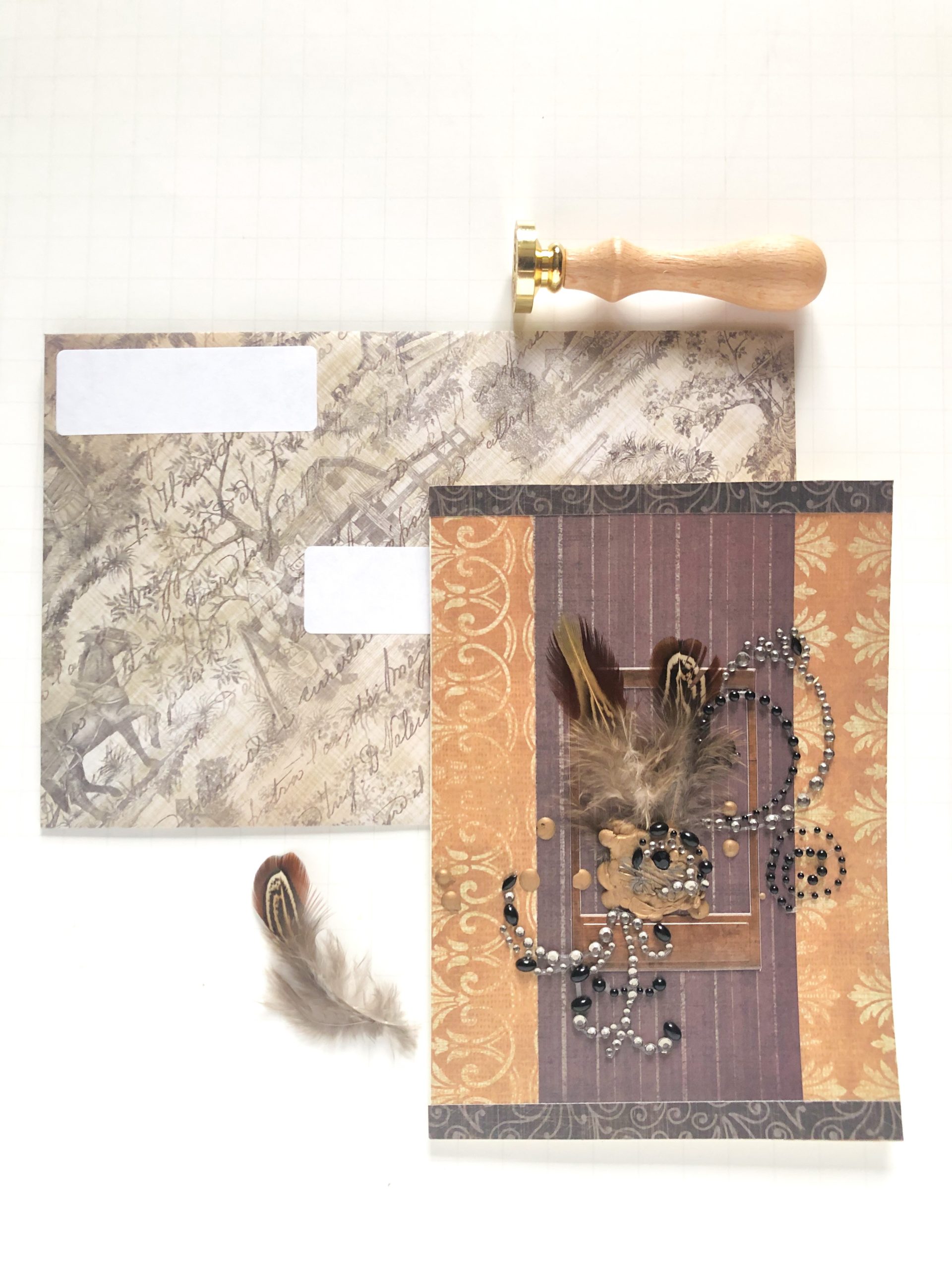 Set includes five handmade greeting cards, blank on the inside, and five handmade accompanying envelopes. The cards feature feathers, wax seal stamps, and various embellishments. Envelopes are approximately 8’ 5/8 “ x 5’ 1/2” , with name and address labels already applied. Each card is one of a kind and can not be reproduced 💜