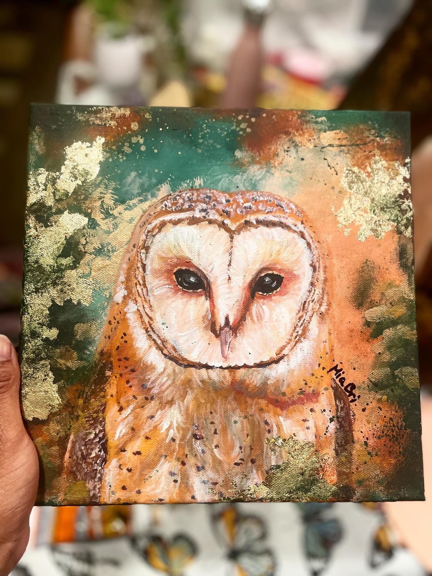 This Harvest Owl Original Painting is a 10 x 10 canvas painted with acrylic paint and gold leaf.  It is a painting of a barn owl and her warm orange and green colors will evoke cozy autumn harvest feels for your home or office space.