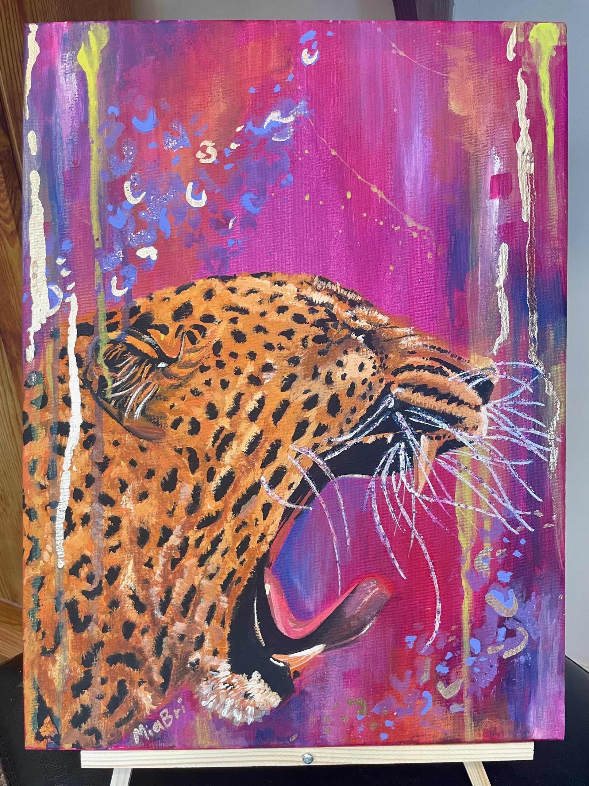 Not A Morning Jaguar is a colorful painting of a yawwwwning jaguar, painted with acrylics and drips of gold leaf paint. AND she has glittery whiskers!