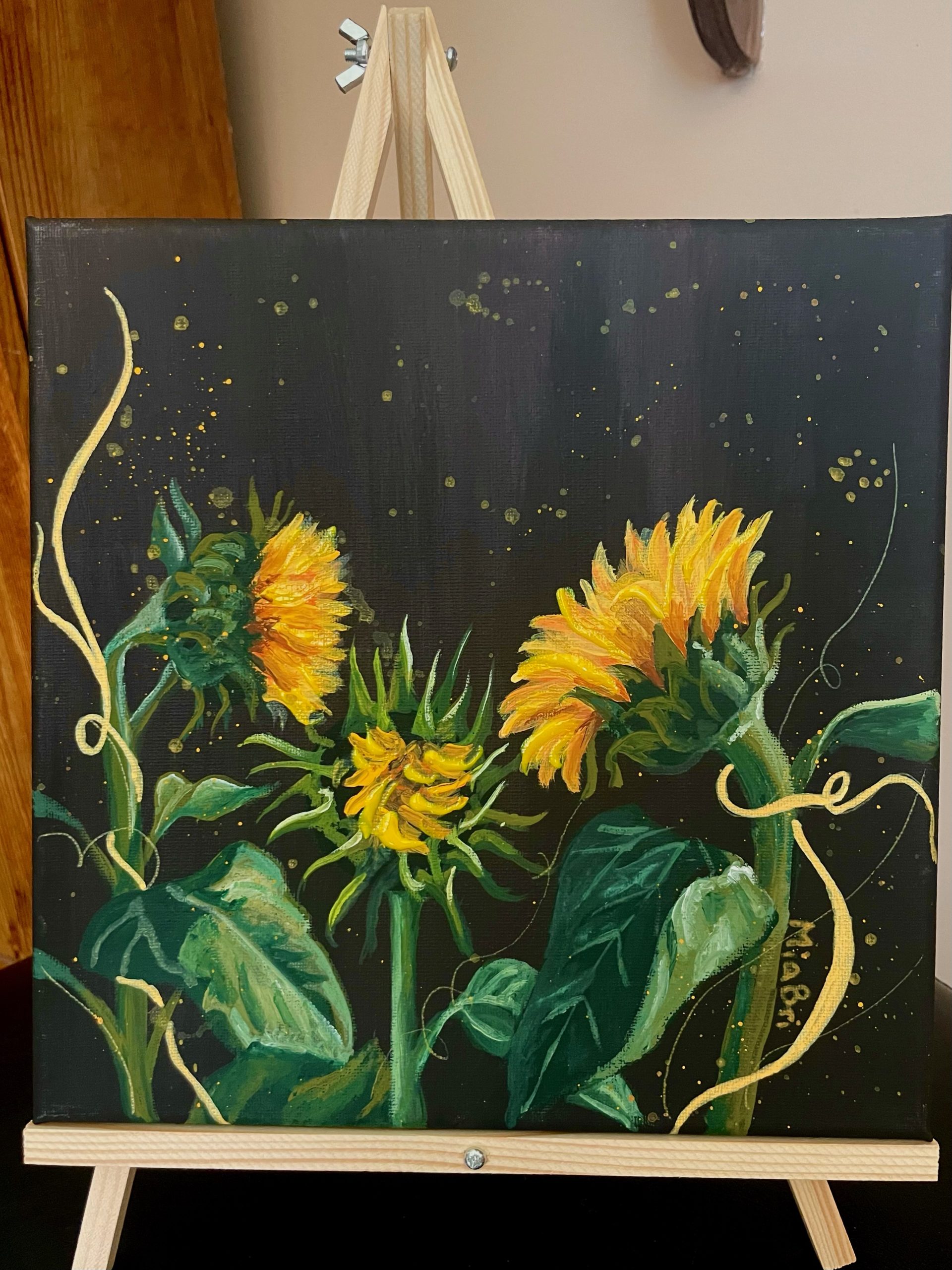The Sunflower 2 painting is a 10 x 10 of sunflowers that have almost bloomed.  Painted with acrylics, puffy paint, and paint markers